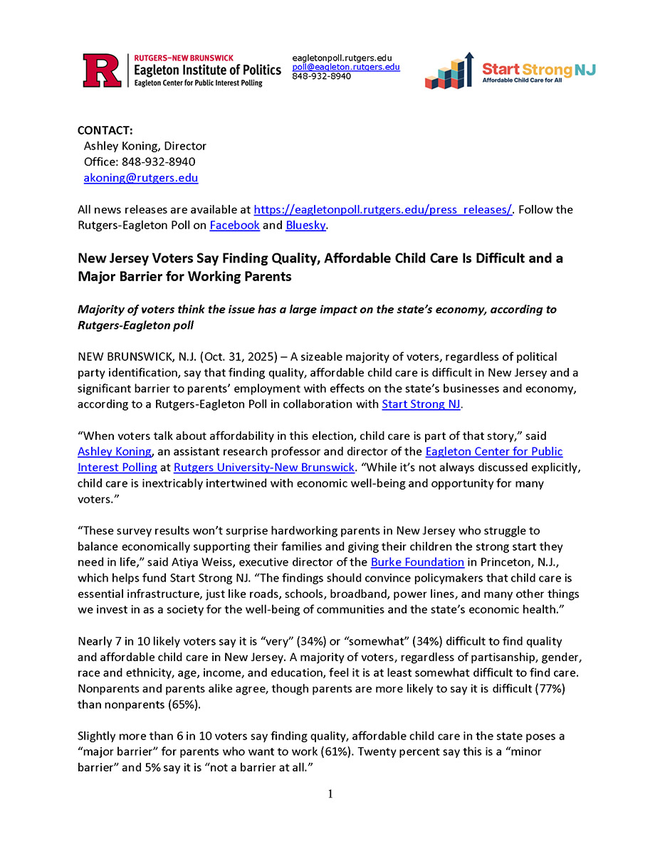 The October 2025 Rutgers–Eagleton Poll surveyed 795 likely voters to capture how New Jersey residents view child care access, affordability, and economic impact. Voters across every demographic group report the same thing: families struggle to find and afford care, and these challenges directly affect parents’ ability to work.